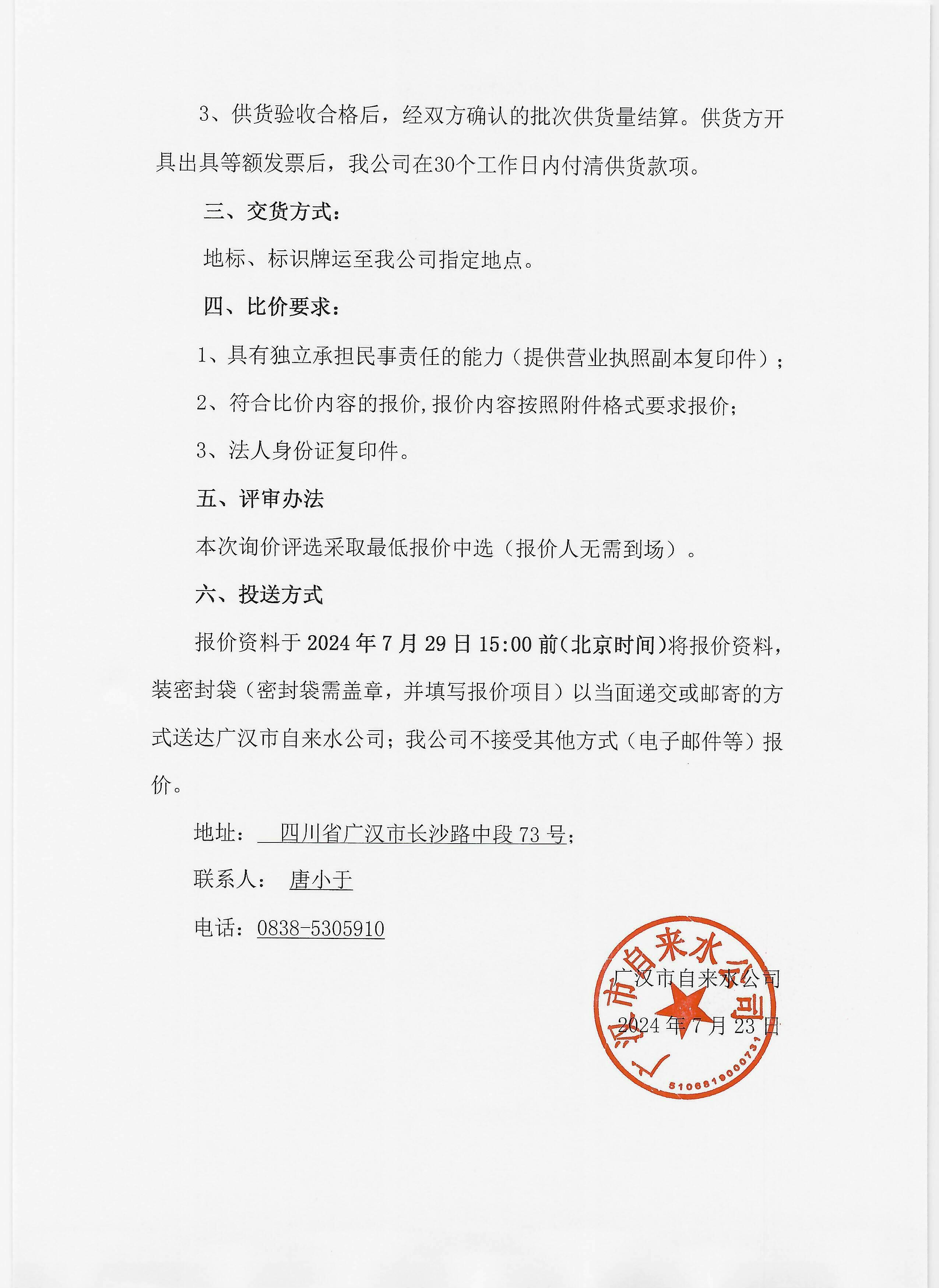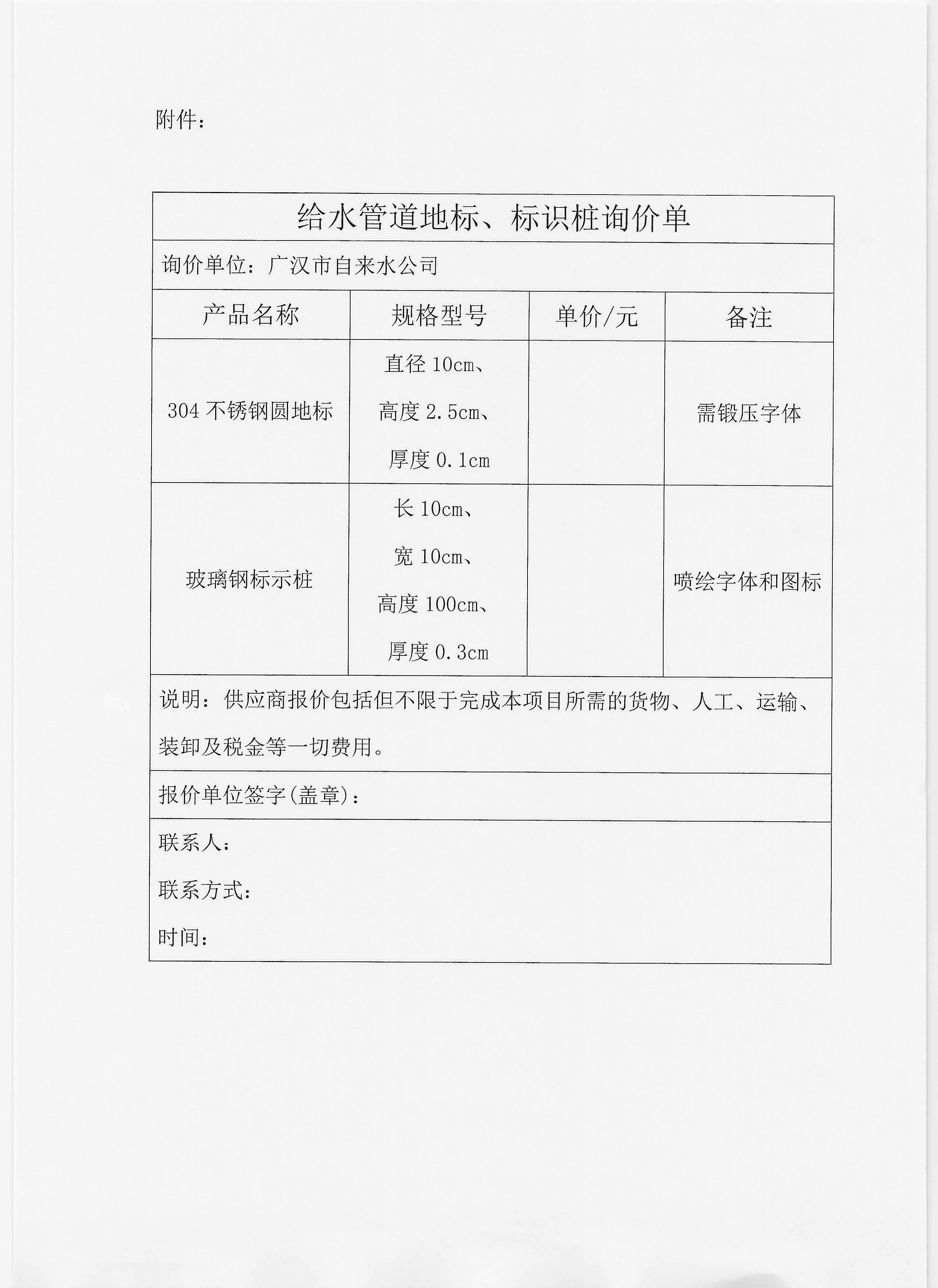 附件下載: 廣漢市自來水公司關(guān)于給水管道地標(biāo)、標(biāo)識(shí)樁項(xiàng)目的詢價(jià)函。